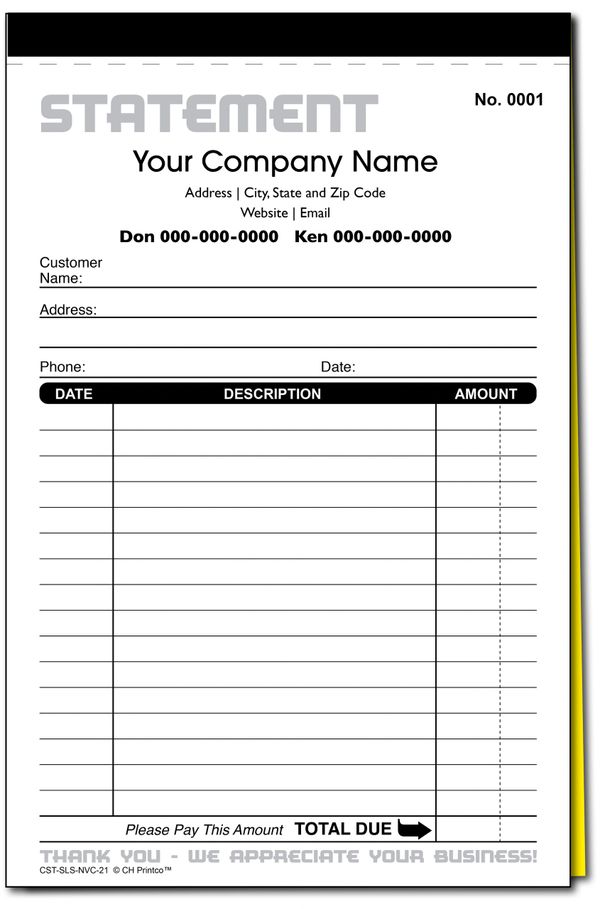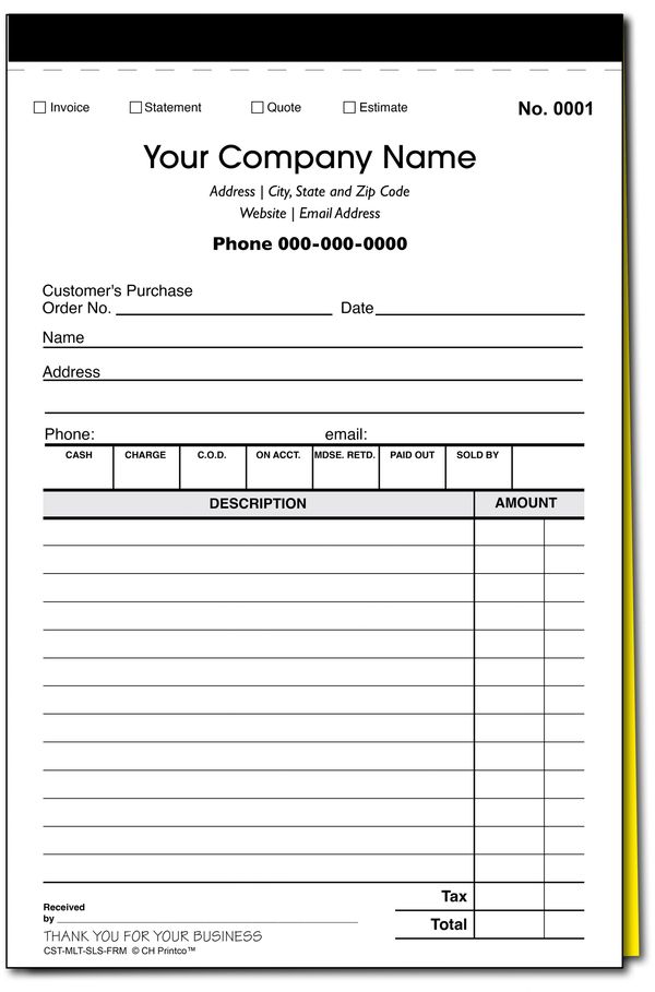 At CH Printco® | statementbooks.com print shop, our custom receipt books are printed on top quality carbonless paper. Your personalized custom invoices will echo the professionalism you desire in the products used in your business. Your imprint will be clear and with our 2-part carbonless paper, your information will transfer flawlessly to the duplicate sheet of your custom printed statements
